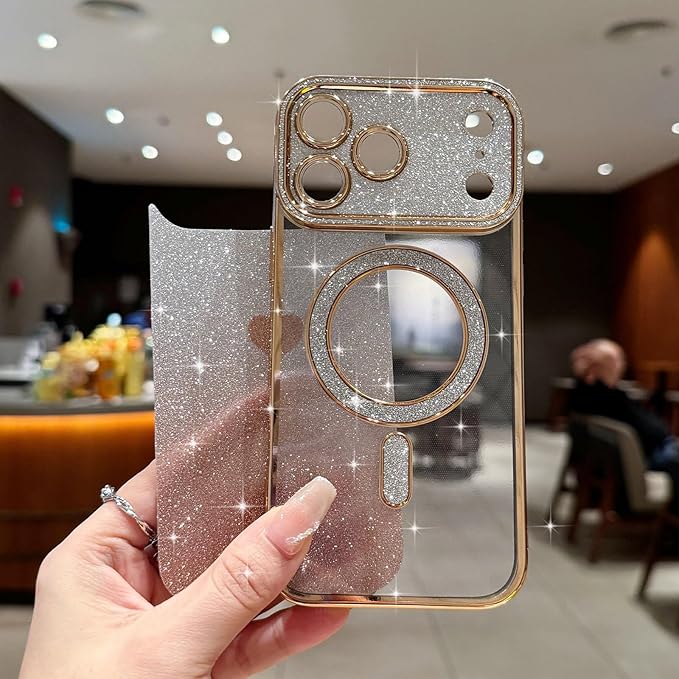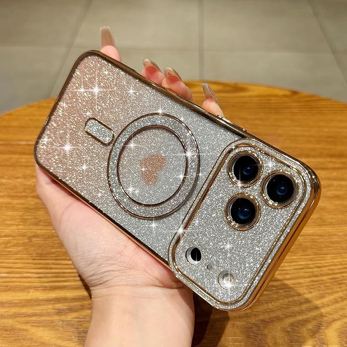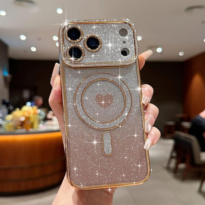 Lafunda iPhone 17 Pro Max 用 ケース キラキラ Magsafe対応 グラデーション ラメ 透明 スマホケース 女の子 かわいい ハート柄 メッキ加工 軽薄型 衝撃吸収 カメラ保護 ワイヤレス充電対応 アイフォン 17 Pro Max 用携帯 マグネットカバー ゴールド | KAZESHOP