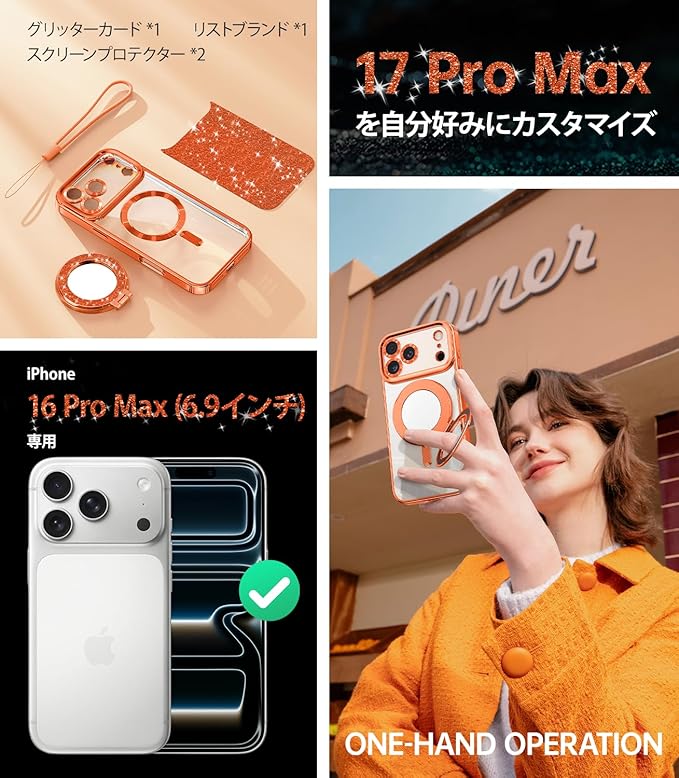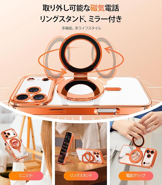 Meifigno マグネット式ケース 取り外し可能なスマホリングスタンド付き iPhone 17 Pro Max 6.9インチ用 [グリッターカード&リストストラップ] [MagSafe対応] [ミラー内蔵] マグネット式スマホリングホルダー + ケースキット、オレンジ | KAZESHOP