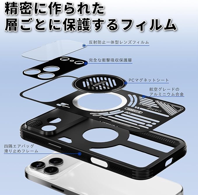 【フルレンズ保護フィルム付き】カメラレンズ一体型保護膜を内蔵。傷つきにくく、汚れに強く、落としても割れにくい安心設計。背面パネルには高強度アルミ合金を採用し、耐久性と高級感を両立。ケースの四隅に衝撃を吸収するエアバッグデザイン、頑丈な構造で、優れる耐衝撃性能。