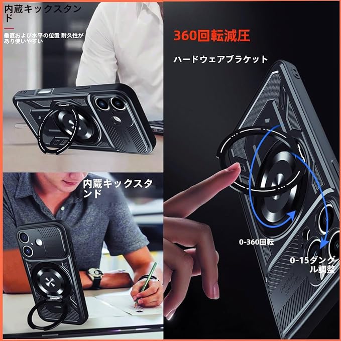 【360 回転スタンド】便利な隠れスタンドはiPhone 17 Pro Max ケースと一体型になり、360 回転できる機能により、横起きあるいは縦起きはもちろん、絶妙なデザインで携帯を自由に多角度を調節でき、力よくスマホを支えて、映像や読書などに楽しめることができます。