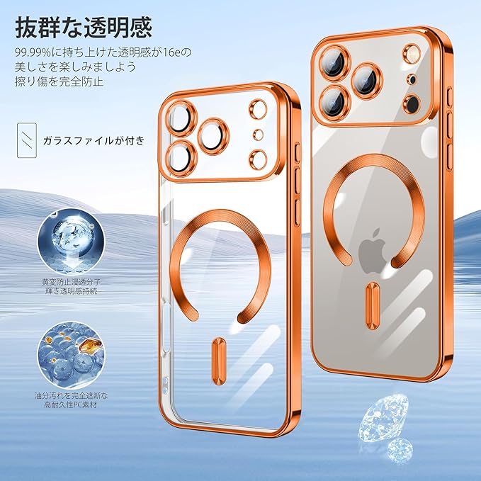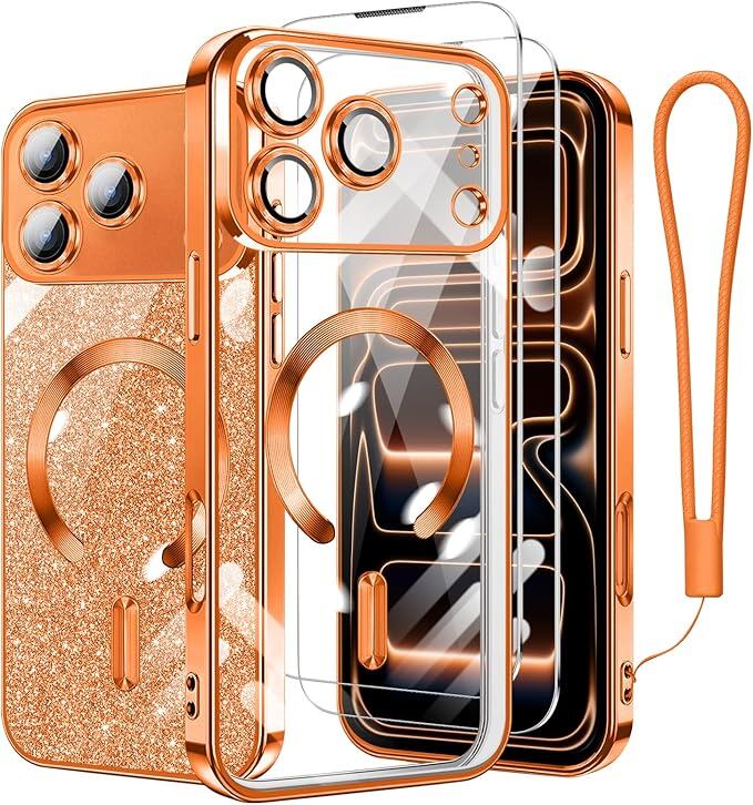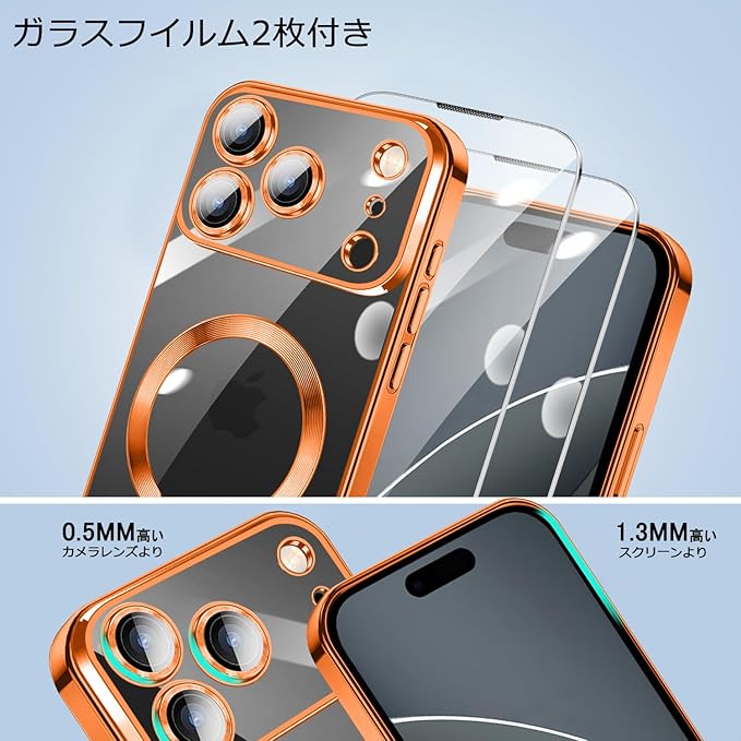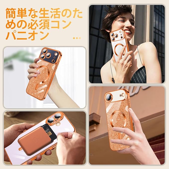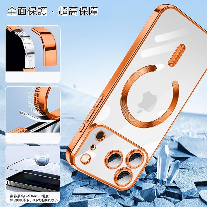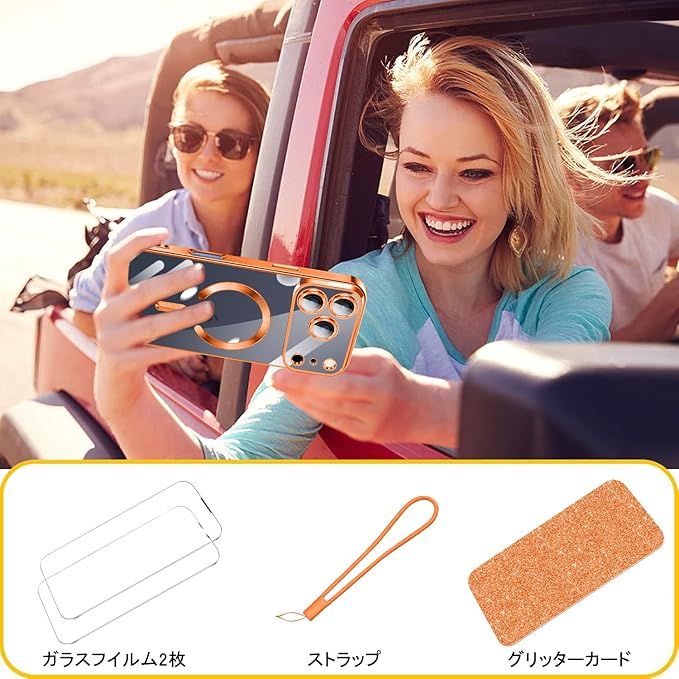 iPhone 17 Pro Max 用 ケース クリア MagSafe対応 マグネット搭載 2枚 HDフィルム付き キラキラ グリッターカード ストラップ付き アイフォン 17 プロ マックス カバー マグセーフ対応 薄型 軽量 レンズ保護 全面保護 耐衝撃(オレンジ) | KAZESHOP