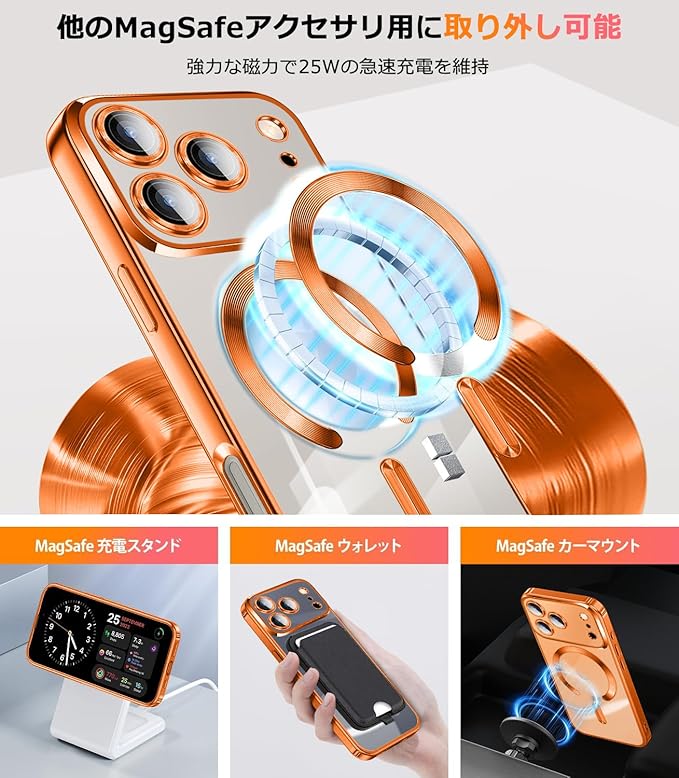 「Magsafe対応」ケースをつけたままマグセーフ機能を快適に使用できます。背面に薄くて強いマグネット内蔵しています、ワイヤレス充電や車載ホルダーやアクセサリとのあらゆる充電に安定で接着ができ、差し込みのいらないより簡単により素早く充電できます。