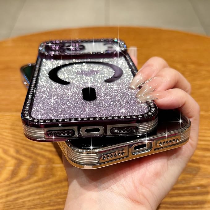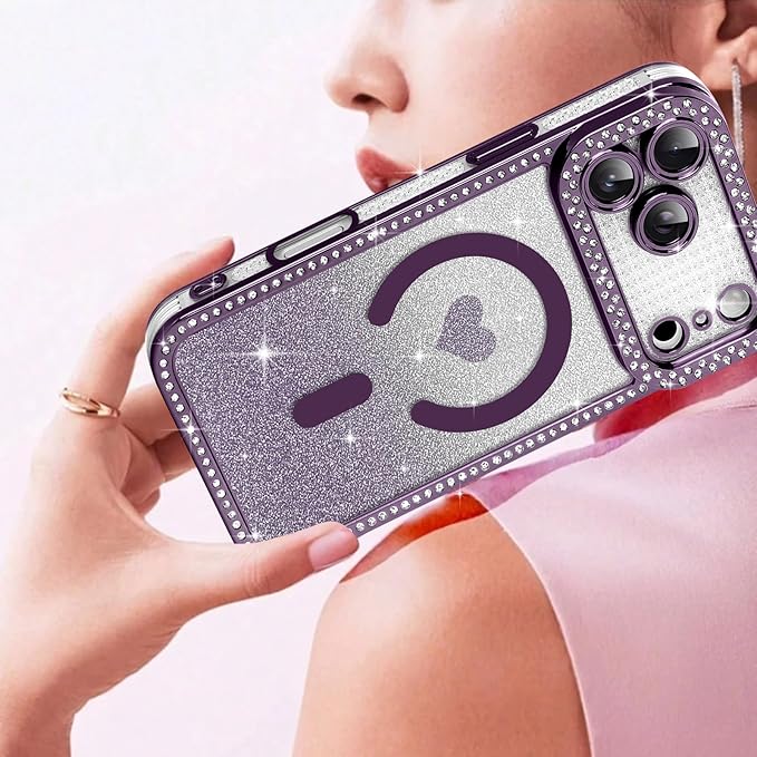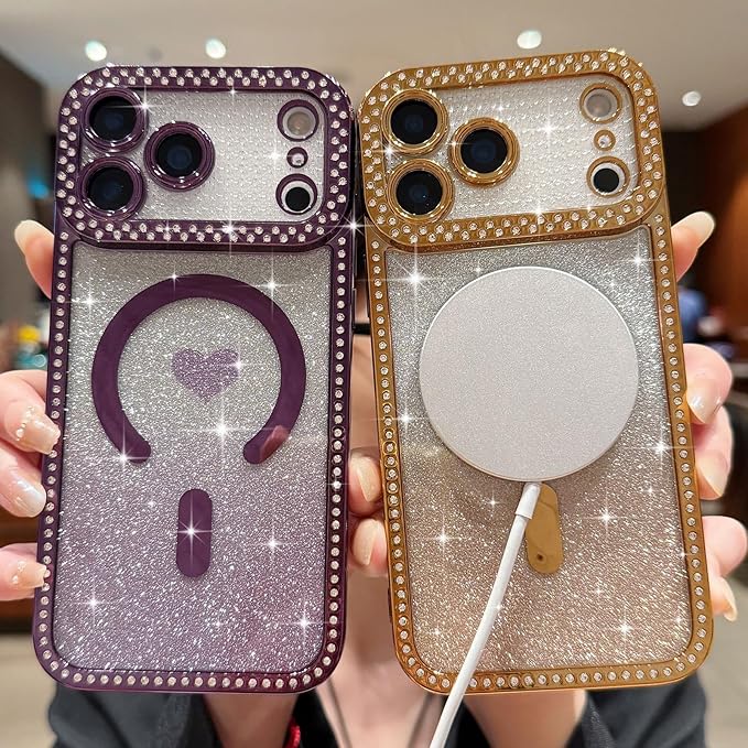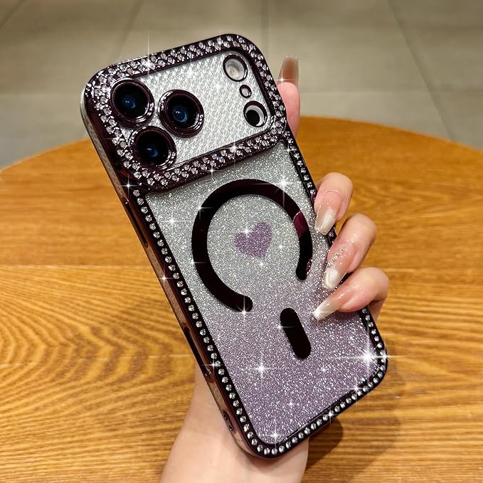 Lafunfa iPhone 17 Pro Max 用 ケース MagSafe対応 かわいい 女の子 キラキラ 透明 マグネットカバー [グリッターカード付き] ハート柄 グラデーション 光沢 ダイヤモンド 軽量衝撃吸収 [フルカメラ保護] ワイヤレス充電 アイフォン 17 Pro Max 用 スマホケース パープル | KAZESHOP