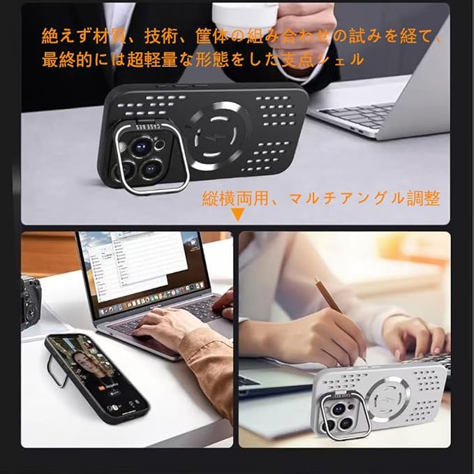 【対応機種】iPhone 17 Pro Maxは専用の設計です。対応機種を間違えないようにしてください。レンズスタンド機能を隠し、多角度自由に調節し、両手を解放します。