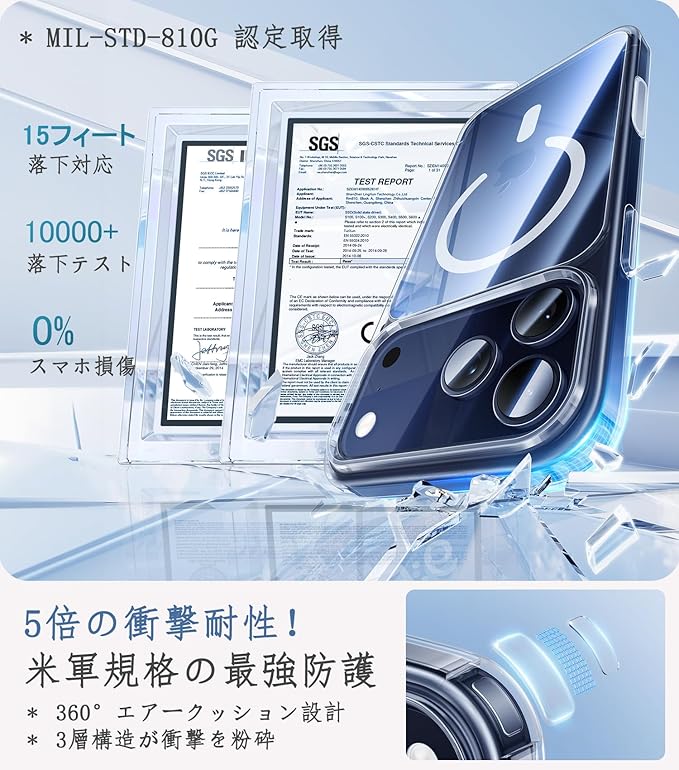 【MIL規格認証-iphone 17promax ケース全面防護】本製品は、MIL-STD-810G 認証を取得した耐衝撃設計を採用。強化された衝撃吸収構造により、米軍規格をクリアした強固な保護性能を実現しました。JIS規格に基づく試験環境において、高さ3.85mからの衝撃に耐える信頼性を証明しています。TPUとPCの3層緩衝構造と強化プロテクションコーナー、画面周り1.5mm/カメラ周り2mmの立ち上がり設計が、99%以上の衝撃エネルギーを吸収。あなたのiPhone 17pro maxを確実に守ります。