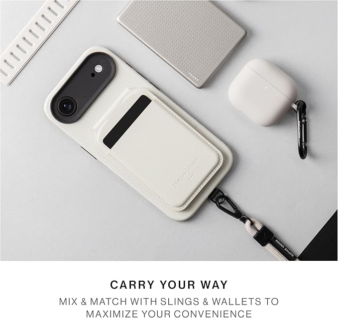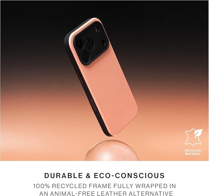 環境負荷を大幅に低減しながら皮革の耐久特性を全て備えた動物由来ではない素材を使用。100%再生TPUフレームを半包みし、環境意識の高い保護を実現。MagSafe対応