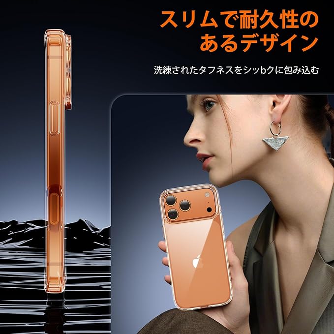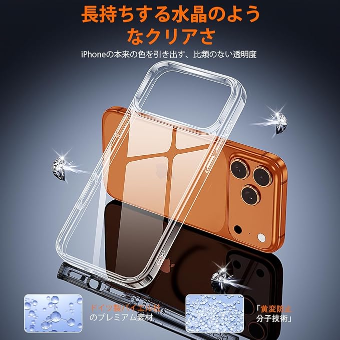 【水晶クリア&黄変防止】バイエル社製の高品質TPU・PC・アクリル背面素材を採用。ナノ酸化防止コーティングにより指紋・皮脂・汚れを防ぎ、長期間使用しても黄ばみやベタつきがありません。iPhone 17 Pro Max本来の美しさをクリアに保ちます。