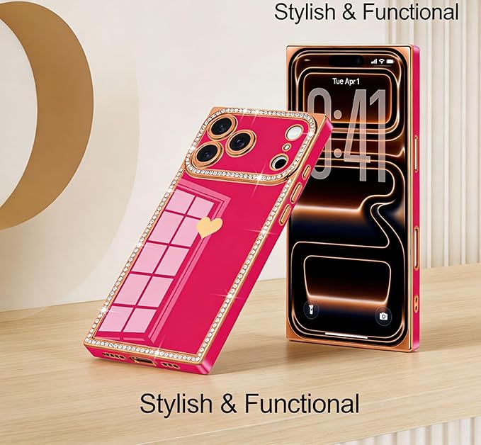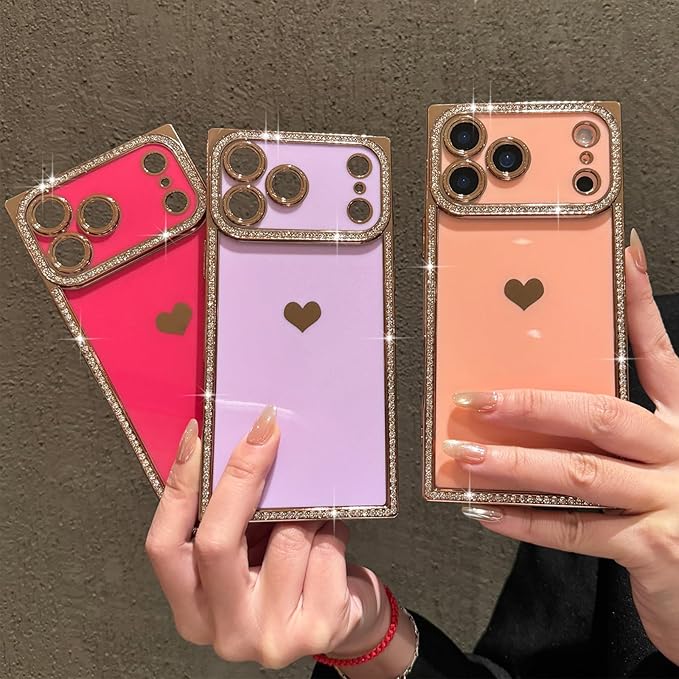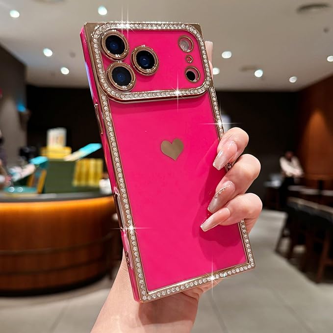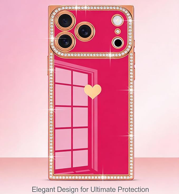 iPhone 17 Pro Max 用 ケース かわいい ハート形 キラキラ ラインストーン メッキ加工 長方形 スマホケース 軽量 落下防止 耐衝撃 おしゃれ 韓国 可愛い 人気 女性 心パターン バンパー 保護カバー (ローズレッド) | KAZESHOP