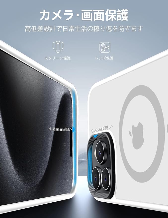 アイホン15 pro max の曲線に従って高低差を設計。液晶画面より1.2mm高く、カメラレンズより1.5mm高く、机などの平面に置いても傷付く心配はない。※本製品は6.7インチしか対応できないですから、ご購入する前サイズを確認ください。