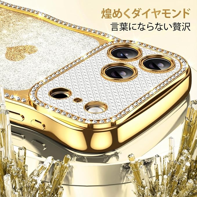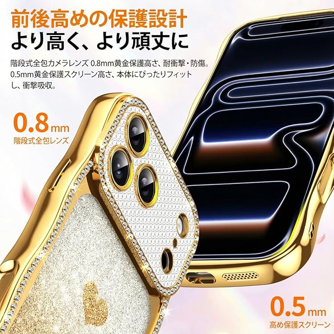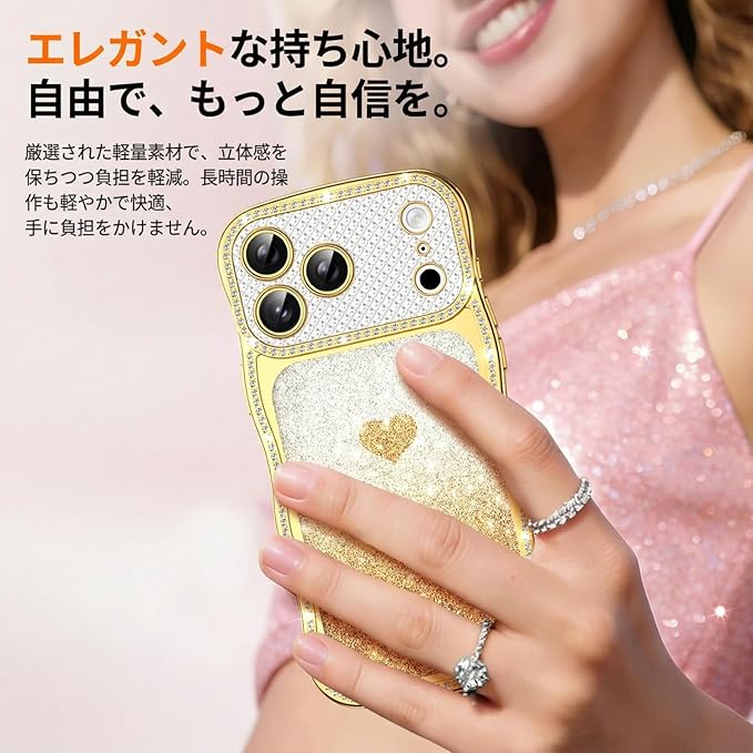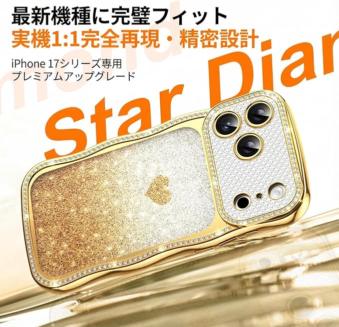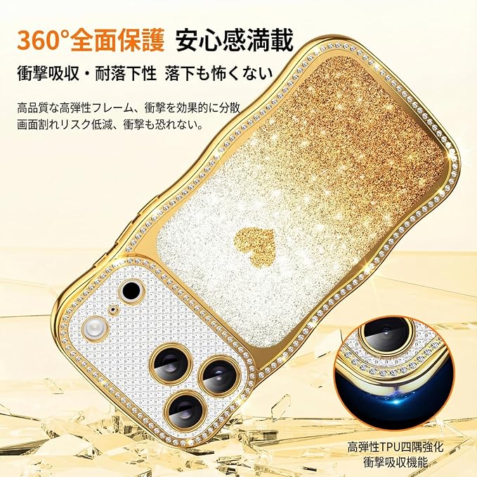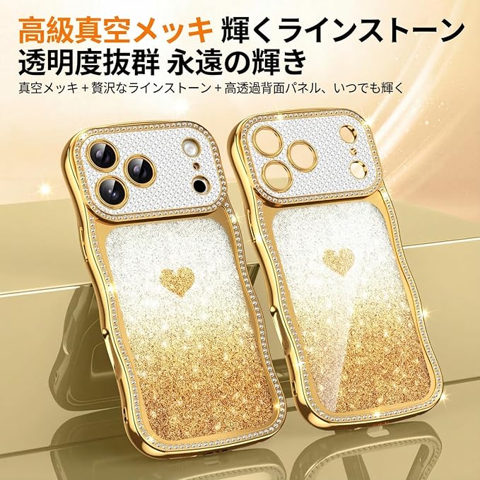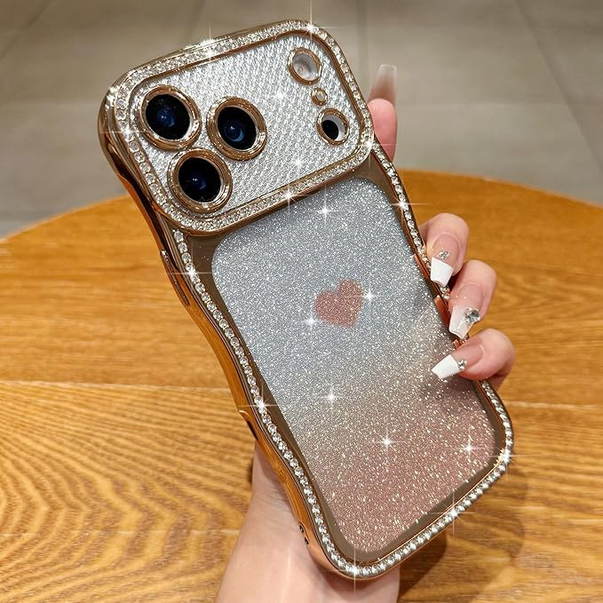 Teageo 用の iPhone 17 Pro Max ケース キラキラ 透明 ウェーブ スマホケース 女性 可愛い グラデーション グリッターカード ダイヤモンド TPU 薄型 軽量 耐衝撃 波型 滑り止め 用の アイフォン 17 Pro Max カバー (ゴールド) | KAZESHOP