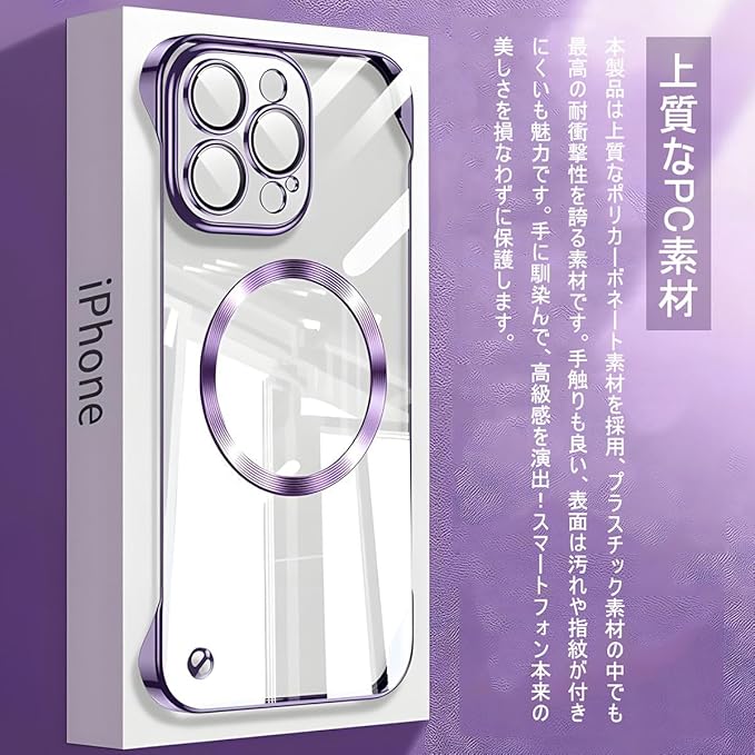 【超薄型フレームレス・上質なPC素材】、【一体型カメラレンズ保護】、【極々透明感】、【MagSafe対応+ストラップホール】、【美しいデザイン】