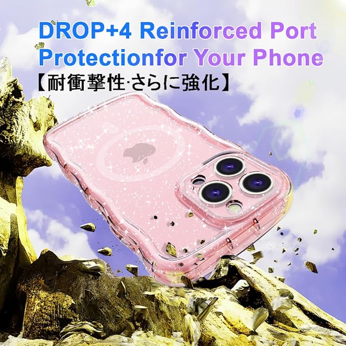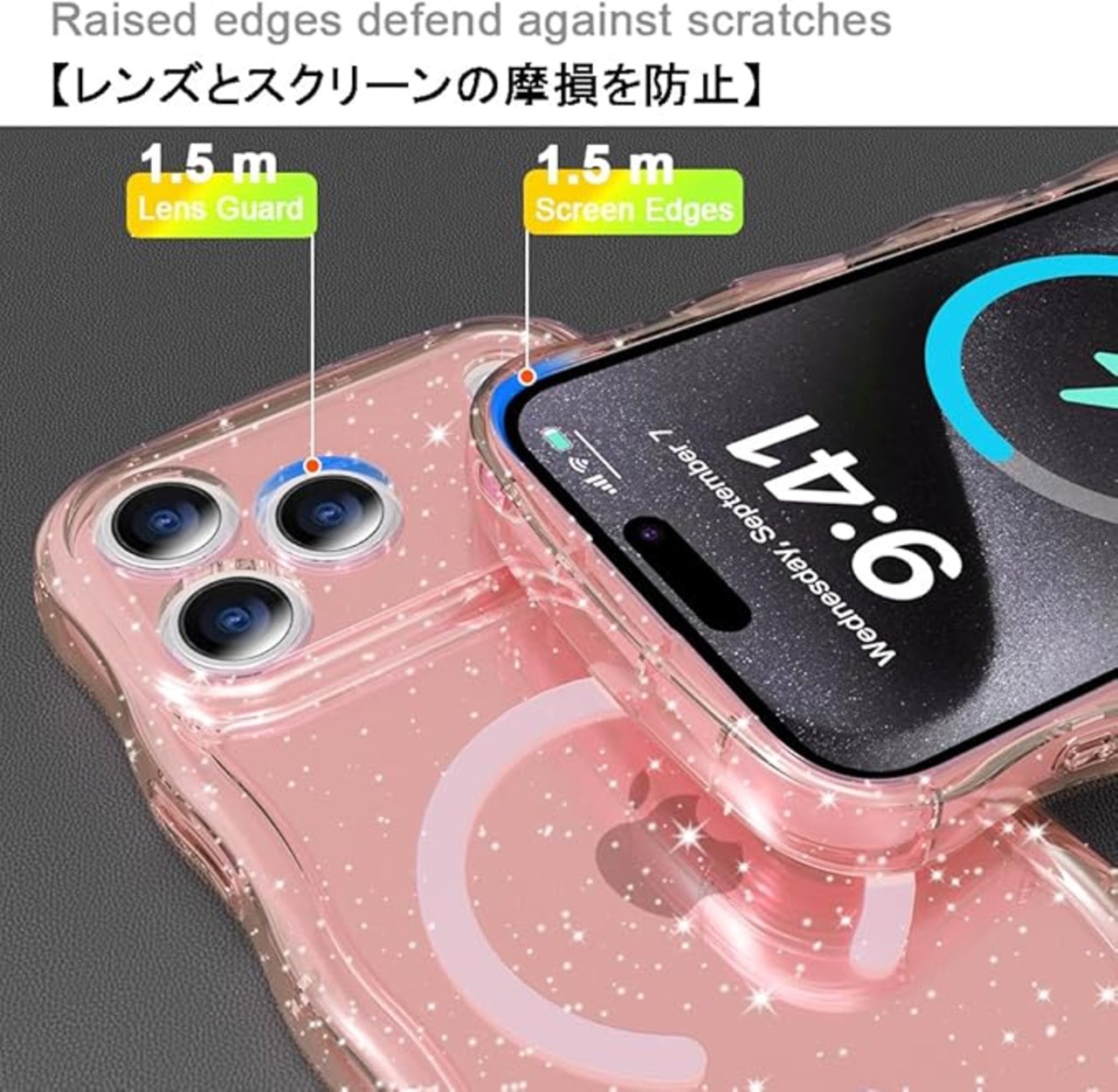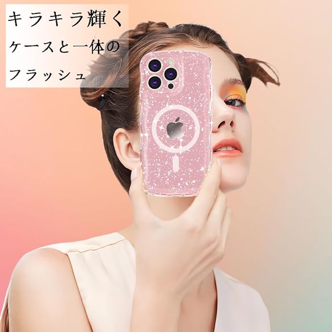 JOOBOY スマホケース 対応 MagSafe対応 クリア 透明 キラキラ フラッシュ ウェーブエッジ 波形 おしゃれ かわいい 高級なTPU素材 TPU+PCパネル ハード 保護カバー 衝撃吸収 ストラップホール付き 携帯電話カバー