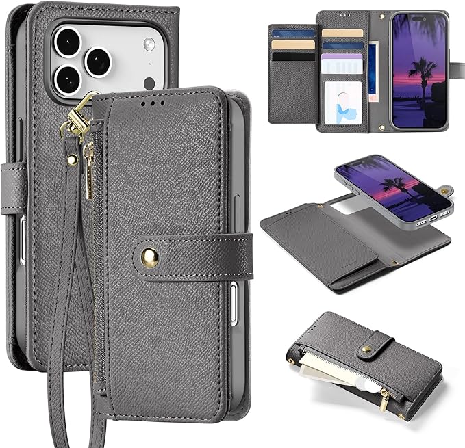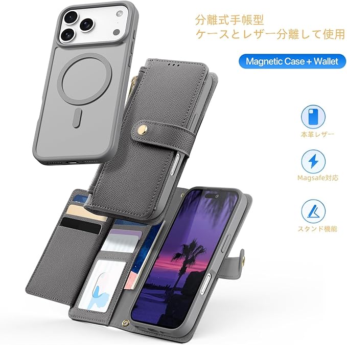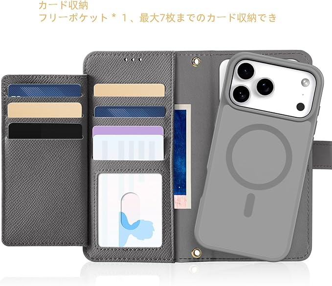本革 外層取り外し可能 iPhone 17 Pro Max ケース 手帳型 7枚 カード収納 アイフォン17promax カバー レザー カードポケット SUGOIDAN 携帯ケース スタンド機能 ストラップ付き 耐衝撃 アイホン17 財布型プロマックス 全面保護(グレー) | KAZESHOP
