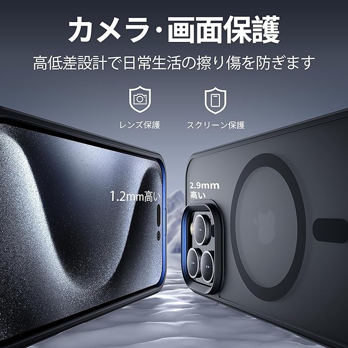 いくら気をつけていても落とす時がある!でも大丈夫!2Mの高さから26回以上落としても本体は綺麗に無傷!背面「カメラエアバッグ」耐衝撃技術も備えています。耐震性の高いTPUバンパーと頑丈なPC背面と組み合わせた二重構造で、非常に高い耐衝撃性を誇り、アイフォン16 Pro Max を全方位からしっかりと守ります。