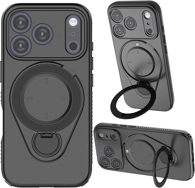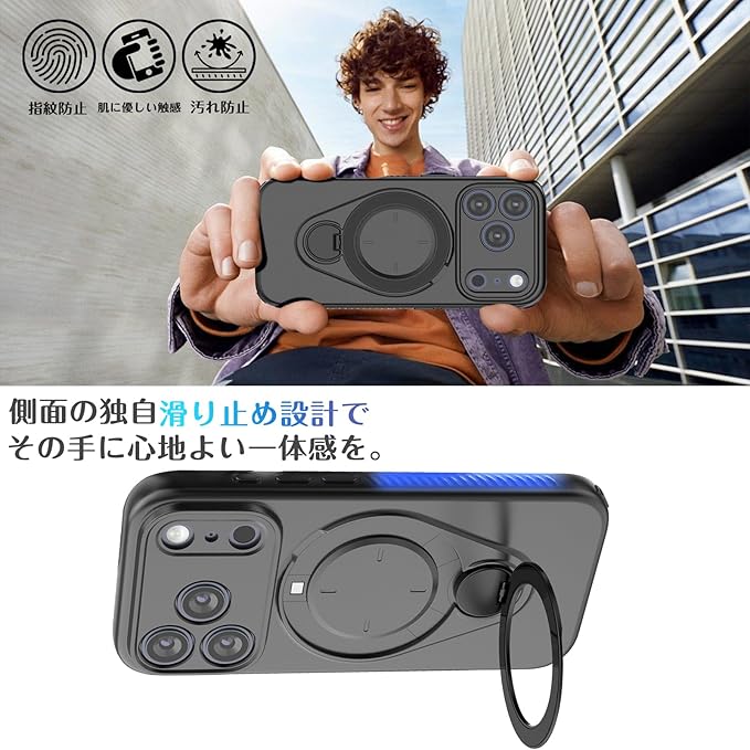 ★【角度調整可能なリングスタンド】私たちのiphone17ProMaxケースの特徴は、回転するたびにカチッと音がするスタンドです。巻き上げ機械式時計のようなものです。360 回転スタンド機能により、縦置き・横置きどちらの状態でも安定して利用でき。動画視聴、ビデオ通話、オンライン学習など、あらゆるシーンで最適な角度に調整し、ハンズフリーで快適に楽しめます。新設計のヒンジはスムーズながらも程よい硬さで、角度をしっかりと固定。指にかければリングも便利に使用でき!ケースを閉じれば背面はスマートに平坦に。