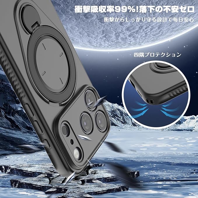 iPhone 17 Pro Max 用ケース 360 回転スタンド 縦横両対応 Magsafe対応 耐衝撃 いphone17 Pro Max スマホケース ワイヤレス充電 衝撃吸収 耐久性 スタンド機能 落下防止 防指紋 リング 滑り止め 全面保護 ストラップホール付き アイフォン17promax 用 カバー ブラック | KAZESHOP