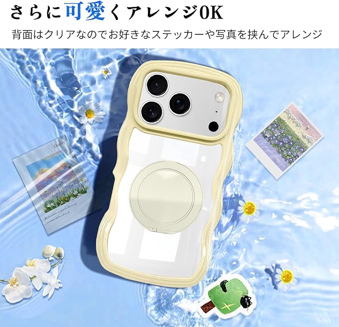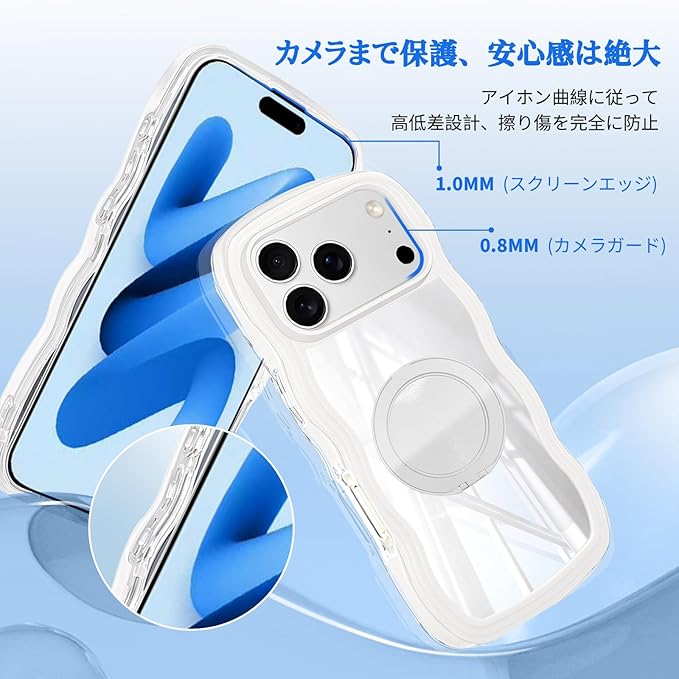 【全方位保護】ケースのカメラ部分は、 あいほん17 Pro Max のカメラレンズよりも高い位置に設定されており、レンズを傷から守ります。また、波型のエッジにはある程度の厚みを持たせているので、万が一 いphone 17 Pro Max を落下させてしまった場合でも、通常のケースよりも全方位的に大切なレンズと画面を保護します。