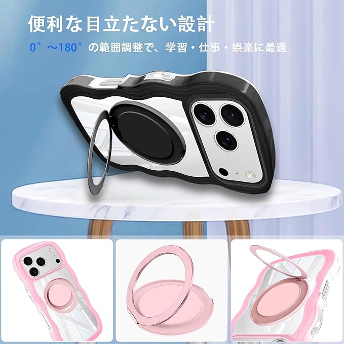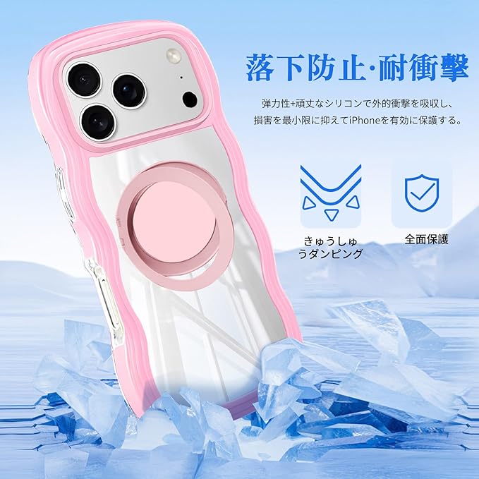 iPhone 17 Pro Max 用 ケース リング クリア アイフォン17 pro max 用 カバー スマホケース 透明 背面ケース 可愛い 波型 耐衝撃 ストラップホール付き 粉 iPhone 対応 カバー 6.9インチ 韓国 人気 ピンク | KAZESHOP