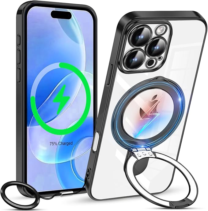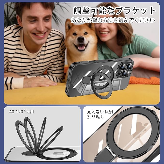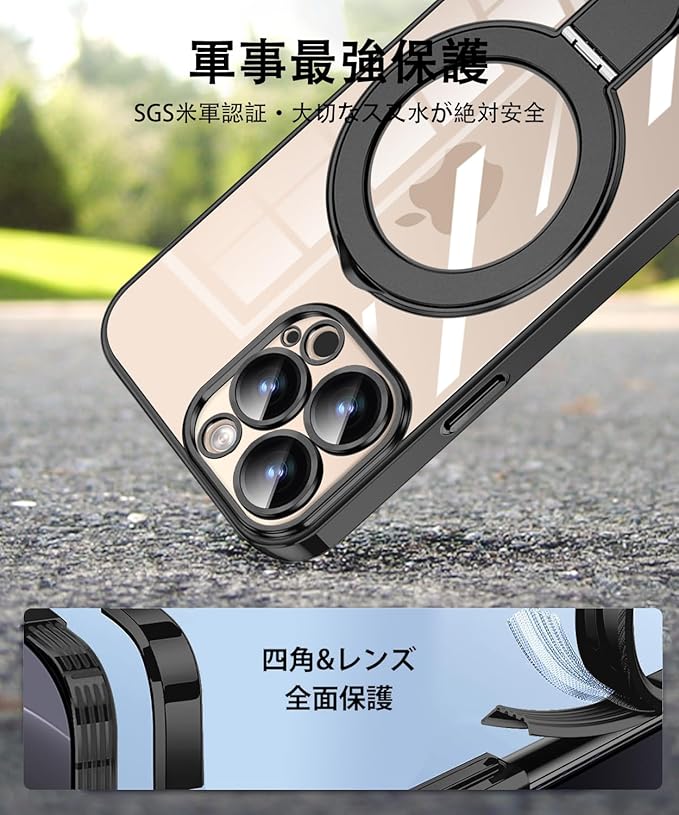 iPhone 16 Pro Max 用 ケース クリア MagSafe対応 隠し スタンドケース 縦横両対応 角度調整 アイフォン16 Pro Max 用 スマホケース 耐衝撃性 リングマグネット搭 携帯カバー ワイヤレス充電対応 透明 ストラップホール付き リングストラップ1枚付き (ブラック) | KAZESHOP