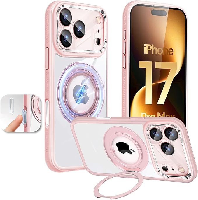 iPhone 17 ProMax用ケース MagSafe対応 クリア シリコン耐衝撃 軽量 黄変防止回転リングスタンド付き カメラコントロールカバー付き自由に取付取り外すカメラカバーレンズ保護 かわいいアイフォン17プロマックスケース ピンク | KAZESHOP