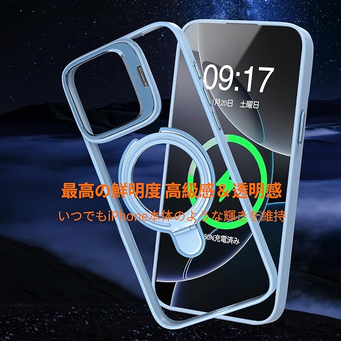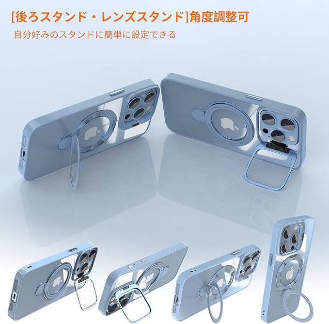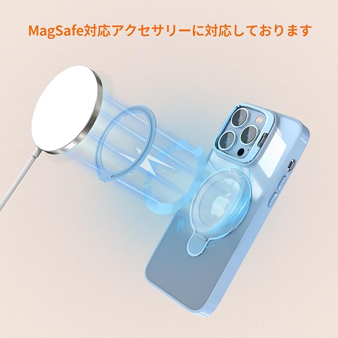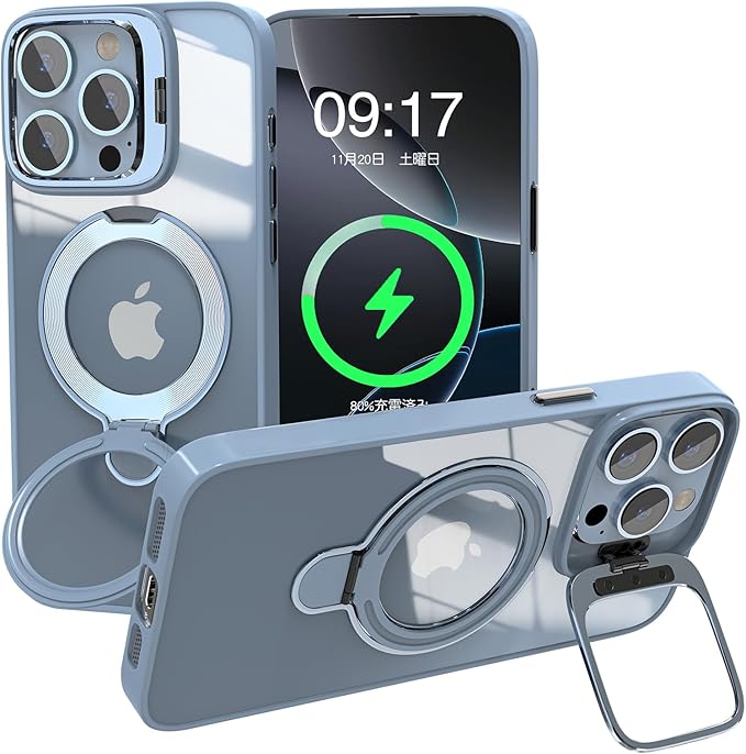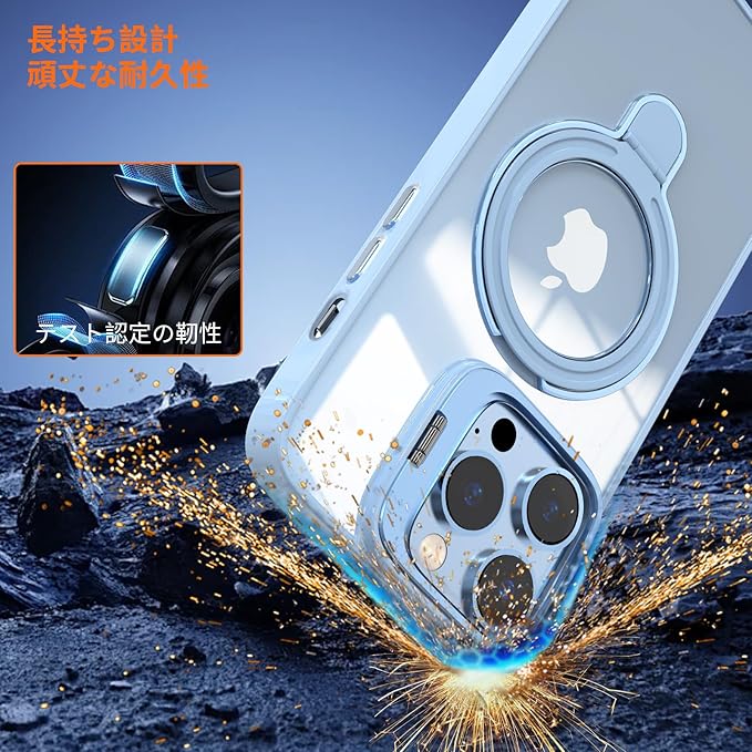 iPhone 13 Pro Max 用 ケース リング レンズスタンド内蔵 縦横両対応 透明 iPhone本体色 黄ばみ防止 ワイヤレス充電 いphone13 Pro Max スマホケース 米軍規格 耐衝撃 携帯カバー アイフォン 13 Pro Max ケース マグネット搭載 車載ホルダー マグセーフ対応 おしゃれ シエラブルー | KAZESHOP