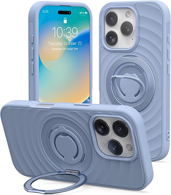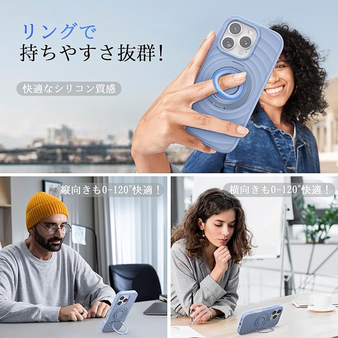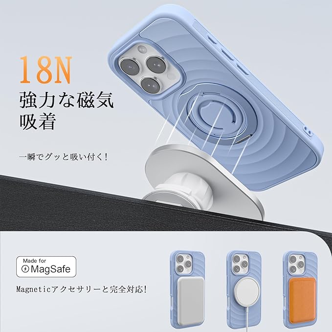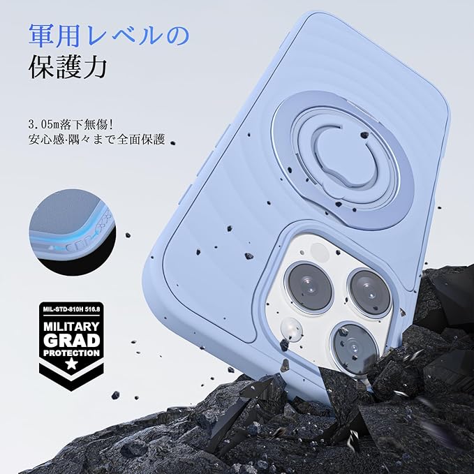 iPhone 16 Pro Max ケース 波模様【360 回転スタンド MagSafe対応】アイフォン16 プロ マックス カバー スマホケース 米軍MIL規格 耐衝撃 全面保護 マット仕上げ 2024年新型 いphone16 Pro Max用ケース【シリコンリング付き】ライトブルー | KAZESHOP