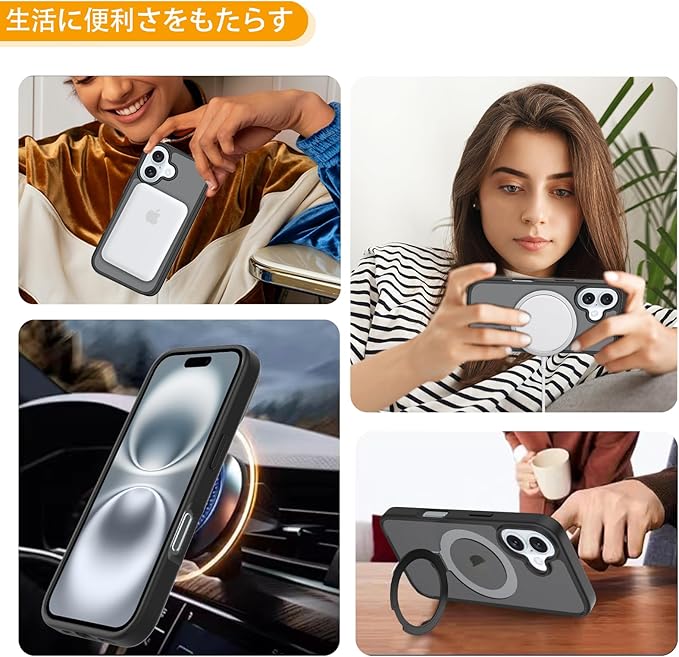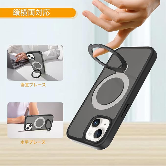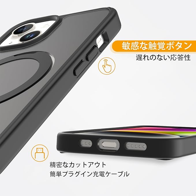 【MagSafe対応】ケースをつけたままマグセーフ機能を快適に使用できます。背面に薄くて強いマグネット内蔵しています、ワイヤレス充電や車載ホルダーやアクセサリとのあらゆる充電に安定で接着ができ、差し込みのいらないより簡単により素早く充電できます。