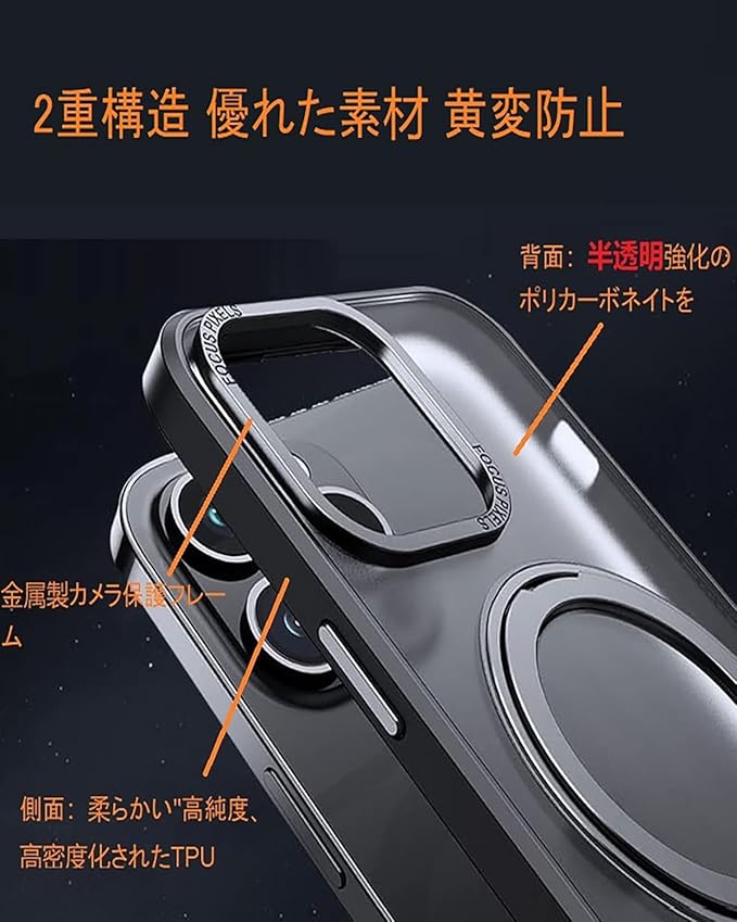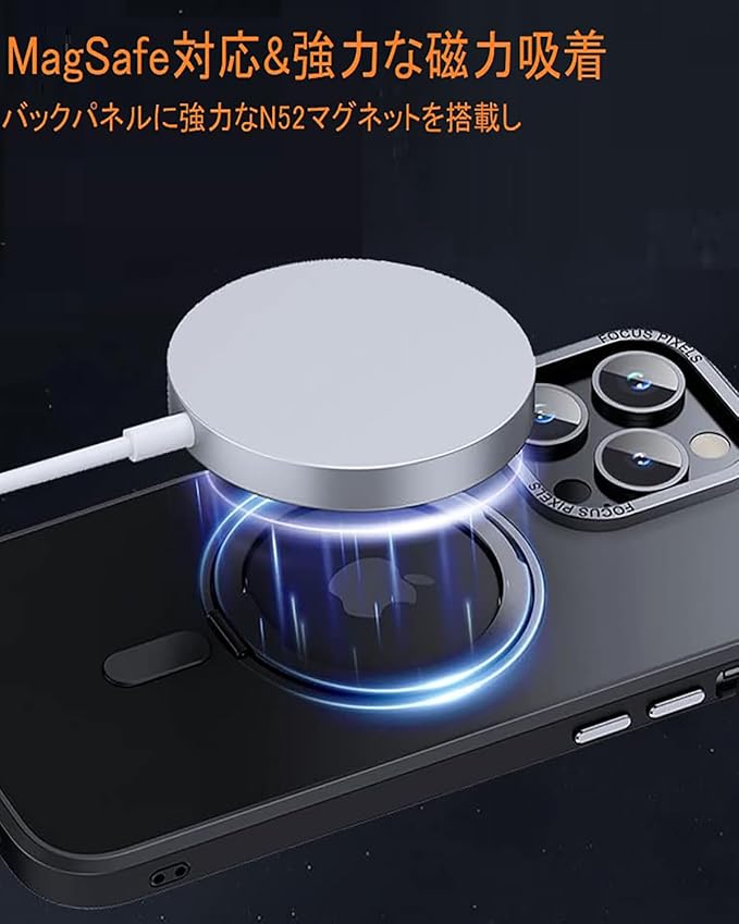 【優良な素材・黄変防止】高級感のポリカーボネイトを採用し、指で触れた瞬間に赤ちゃんのお肌のようにサラサラして快適です。側面を柔らかい"高純度、高密度化されたTPU"のソフトな素材で衝撃を吸収させ、吸収性能が優れ、傷から守ります。こう言う革新浸透テクノロジーで、黄変防止を実現。Magsafe対応の強力マグネットはその安全性と性能により安定した充電と付着力を発揮します。