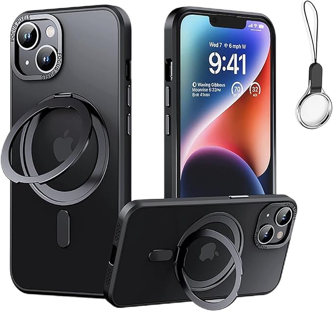 iPhone 15 Pro Max 用 ケース Magsafe対応【360 回転可能な Magsafeリングスタンド ホルダー 一体型・ストラップ1種付き】アイフォン15 プロ マックスカバースタンド機能 縦横両対応 HILEGENER スマホケース 耐衝撃 カメラレンズ保護 半透明 マット感 隠しスタンドケース ストラップホール付き あいほん15 Pro Max-ブラック | KAZESHOP