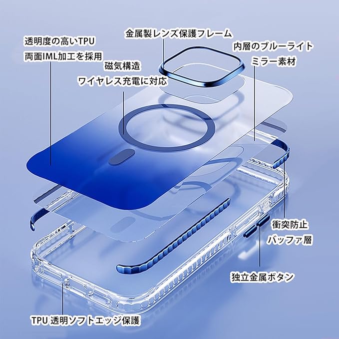 Angeo iPhone 16 Pro Max 用 ケース グラデーション透明 MagSafe対応 ワイヤレス充電 マグネット搭載 耐衝撃 薄型 バンパー 傷に強い背面 黄ばみなし 防指紋 い マグネット ケース iPhone16 pro max 用ケースクリア 保護 iPhone 16Pro Max 用 クリア 保護ケース、グラデーションブルー | KAZESHOP