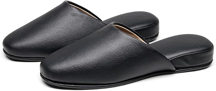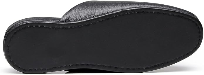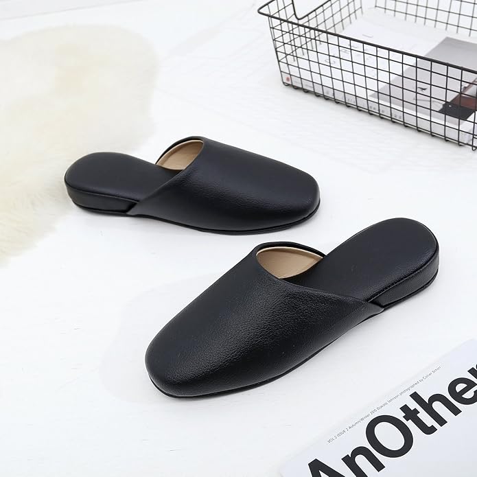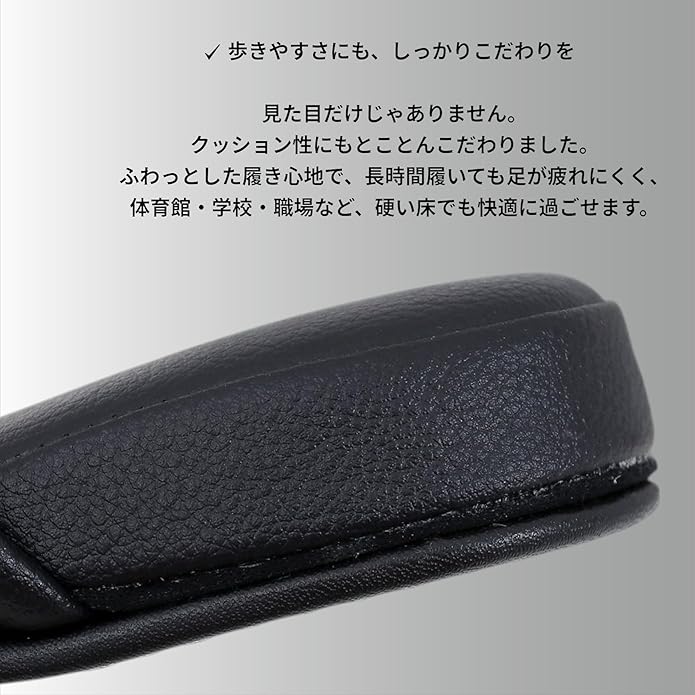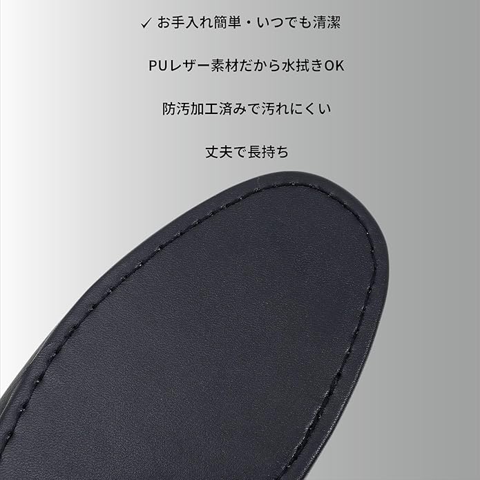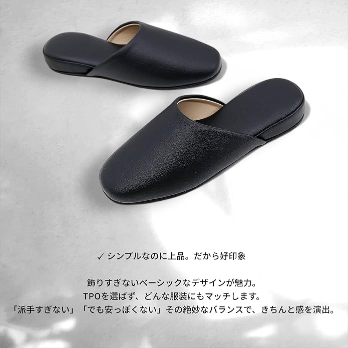 【水拭きOK】【防汚加工済】上質なPUレザー製スリッパ。椅子張り地の老舗ブランドのPUレザーを使用したスリッパ。 家庭やトイレでの使用はもちろん、卒業式入学式授業参観用として使用可能。さらにクレヨン・コーヒーなどに対応した防汚加工済み。 底面には凸凹状のPVCを使用し、滑り止め効果があります。 全面水吹き可能素材です。 甲裏には革靴にも使用されているベージュレザーを使用しフォーマルシーンにもご利用いただけます。 サイズ:M(23.5~25.5cm)L(25.5cm~27.5cm) カラー:ブラック 材質 :表地・中敷:PUレザー、底面:PVC 製造国:インドネシア製 かかと:約3cm