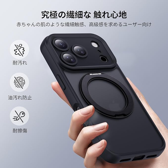 Aunote いphone17pro max ケース 精密カメラ保護 360 回転スタンド MagSafe対応 薄型 軽量 米軍MIL規格 耐衝撃 黄変防止 スマホケース iPhone17promax ケース カバー ブラック | KAZESHOP
