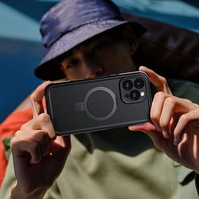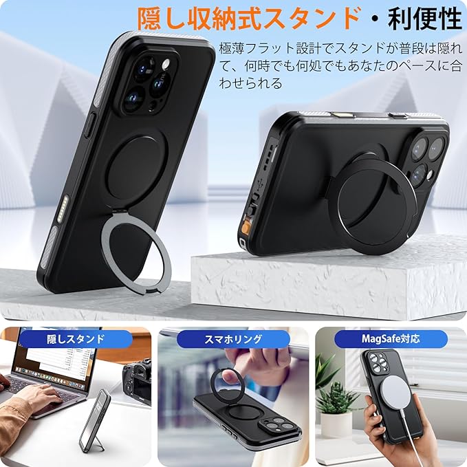 【隠し収納式スタンド・Magsafe対応】極薄フラット設計でスタンドが普段は隠れて、欲しい時だけ出せる、そしてスマホをポケットに入れたりする時に引っかかる事なく、何時でも何処でもあなたのペースに合わせられる。マグネットが内蔵されており、エネルギー無損失の急速ワイヤレス充電できます。