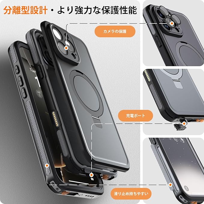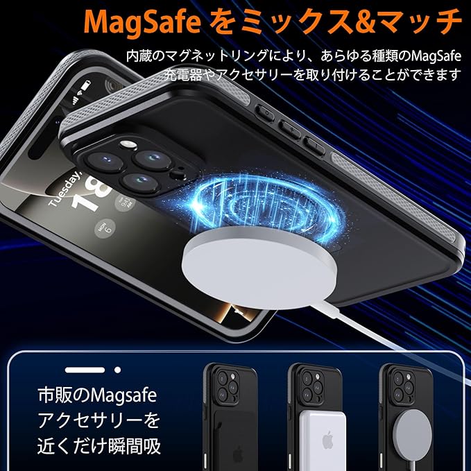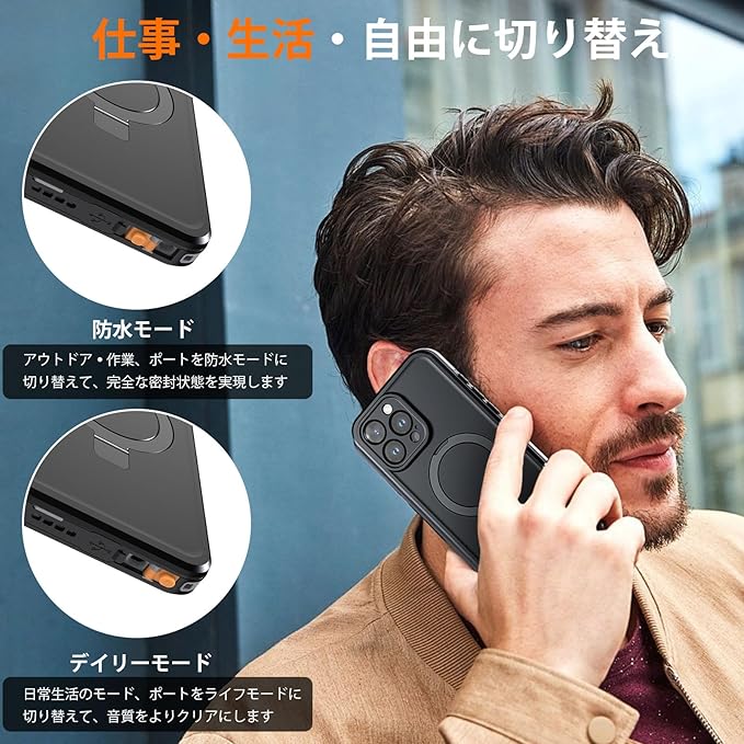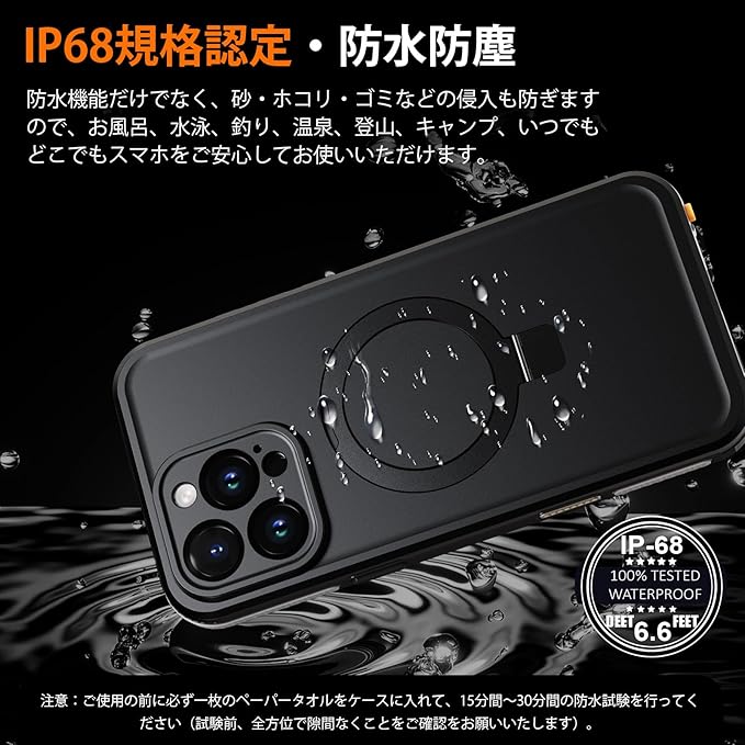【IP68防水・防塵規格】iPhone 16 Pro Maxに対応。本ケースは端末を完全に覆い、完全防水・防塵仕様により、水深さ2Mの水中に1時間まで水没できます。水気の多い場所でもスマホを守ってくれるため、いつもで安心してご利用いいただけます。さらに、水中撮影でも対応出来ます。
