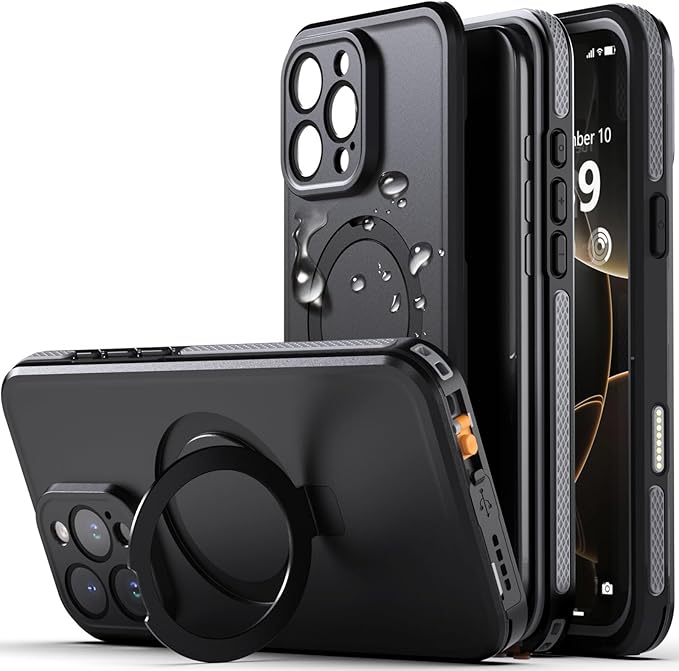 【IP68防水・隠し収納式スタンド】iPhone 16 Pro Max 用 ケース 防水 衝撃吸収 米軍MIL規格 水中撮影対応 Magsafe対応 顔認証対応 全面保護 完全防水 防雪 防塵 滑り止め 手持ちやすい 頑丈 耐衝撃ストラップ付き 雨の日、お風呂など適用 防水ケース( 6.9インチ) | KAZESHOP