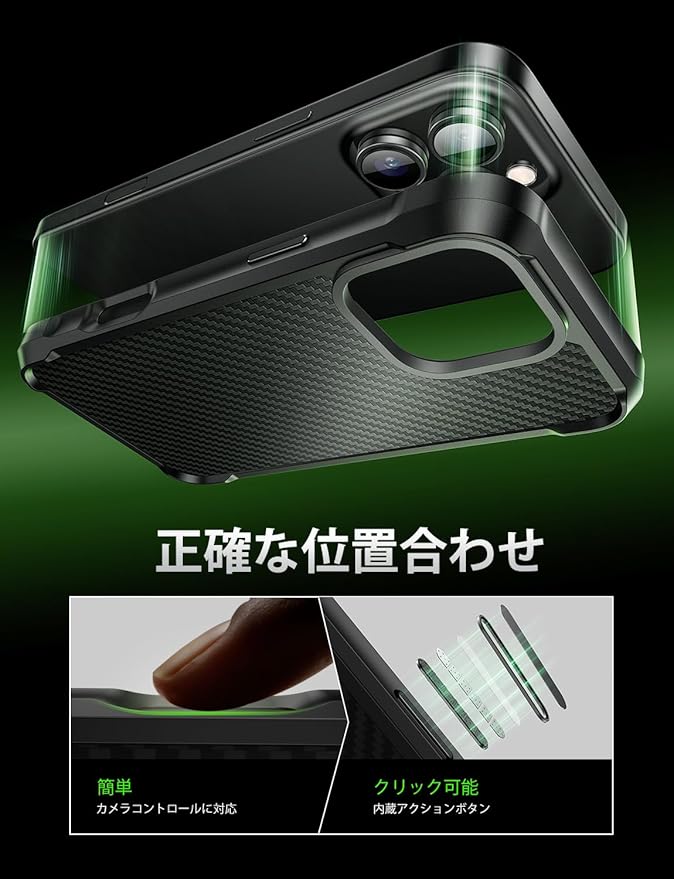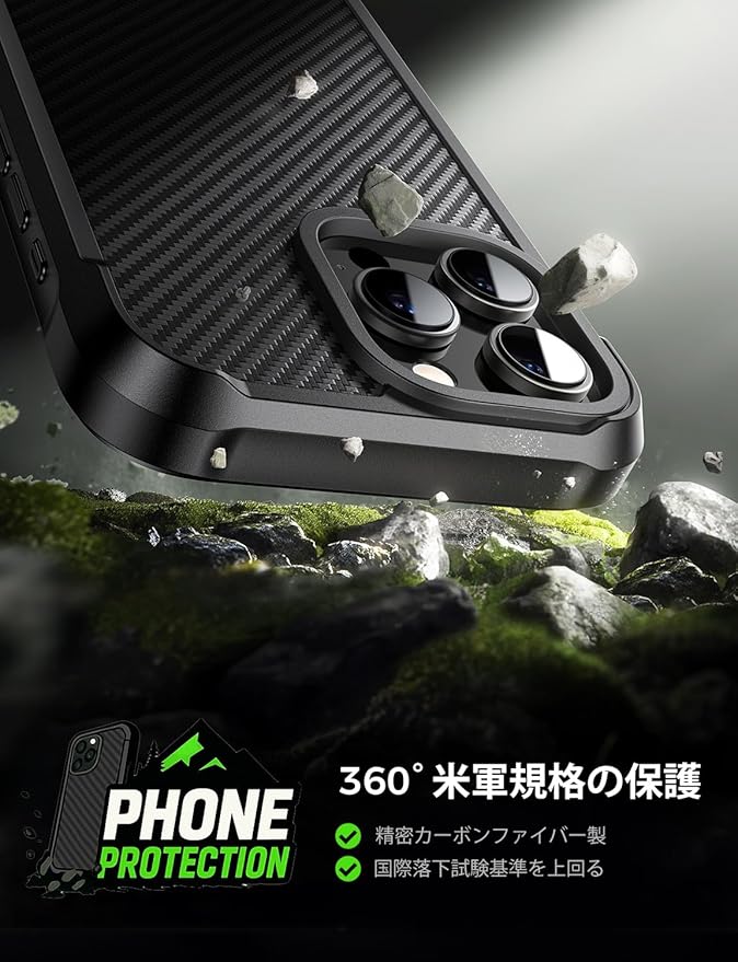 【高品質素材・対応機種】iPhone 16 Pro Max用ブラックケース。本製品は高純度のカーボンファイバー素材を採用し、普通のケースより、5倍強度を持ちます。特別な編み込み模様が角度によって3D立体感を生み出します。スマホケースに上品で洗練されたビジネス向けの雰囲気を与えます。さらに、多層のカーボンファイバーバックパネル構造により、衝撃力を効果的に分散させ、日常の擦り傷からもスマホを守る設計となっています。
