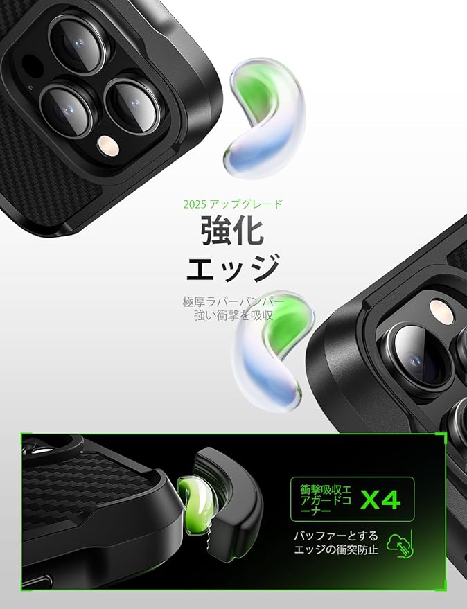 【衝撃防止・耐久性】四隅に強化型ショック吸収ゴムを配置したと同時に、レンズリングを高めることで、画面とカメラレンズの傷や衝撃から守られます。細部まで柔らかいゴムで包まれてスマホを全方位で保護できます。TPU素材の高弾性と多方向回復減震技術によって、落下時の衝撃を吸収可能です(約1.8mの高さからの落下衝撃を保護可能)。