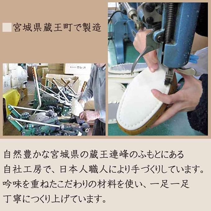 宮城県蔵王町の自社スリッパ工房にて、全て日本人職人の手により、一点一点真面目に手作りしています。企画から資材の調達・製造・販売まで一貫して自社で行い、表生地はもちろん、コストダウンの対象になりがちな裏地・中材まで、可能な限り国産の良い材料を使っています。こだわりながらも他社を極力介さずに余計な諸経費を抑え、このCPが実現できております。