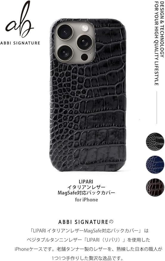 ABBI SIGNATUREの「LIPARI イタリアンレザーMagSafe対応バックカバー」は、ベジタブルタンニンレザー「LIPARI(リパリ)」を使用したiPhoneケースです。老舗タンナー製のレザーを、熟練した日本の職人が1つ1つ手作りした贅沢な逸品です。