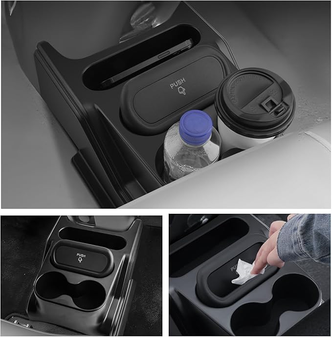 【お手入れ簡単】中央のPUSH式ミニゴミ箱は取り外し可能で、汚れたらサッと取り出して水洗いでOK、いつでも清潔な車内環境を保てます。
