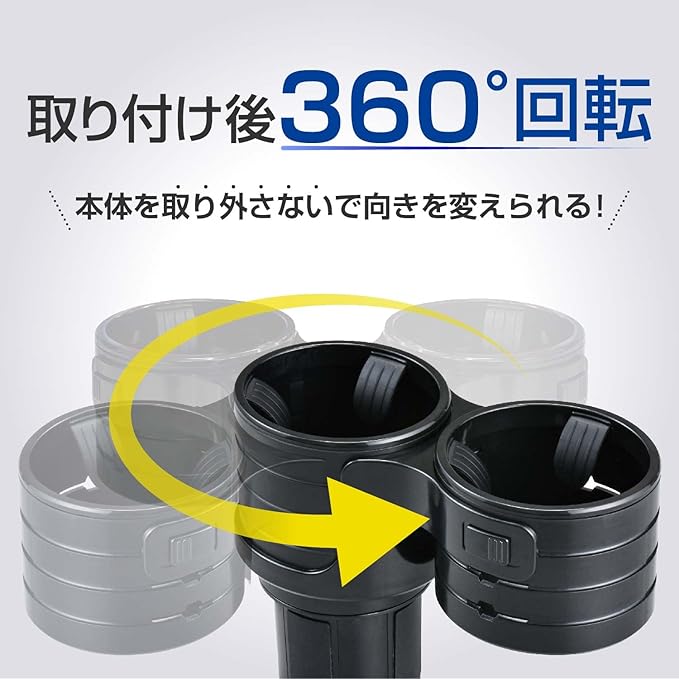 高さ調節機能により縁に段差のあるカップホルダーにも取り付け可能です。回転機能も付いて対応車種が大幅UPしました。