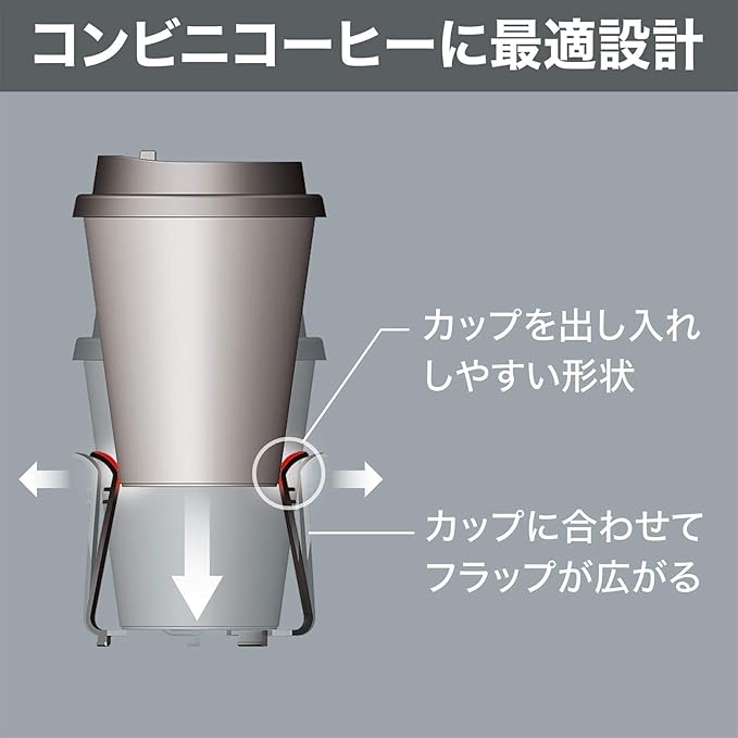 コンビニコーヒーにおススメの、ドリンクがガタつかないドリンクホルダーです。4方向からドリンクを包むようにホールドすることで、スポッと収まりつつ出し入れしやすいドリンクホルダーになっています。