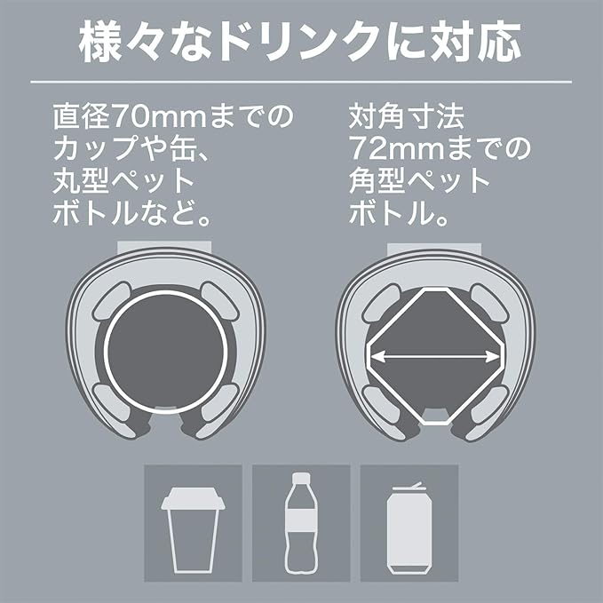 直径70mmまでのカップ・缶・丸型ペットボトル、対角寸法72mmまでの角型ペットボトルが使用できます。