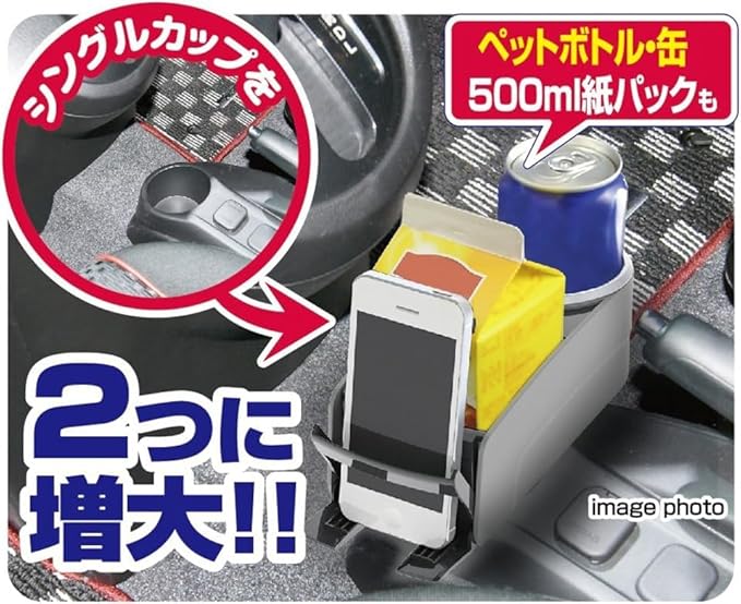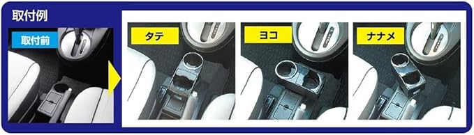 缶ドリンク2本同時収納。一つのドリンクホルダーを利用してドリンクを2本収納することができます。小物収納スペース。収納可能で、使わない特にも邪魔になりません。車種に合わせた取付設置が可能。本体設置はスライドするのでお好みの位置に設置できます。取付設置簡単。取付ブラケットがセパレート式になり、取付が簡単。