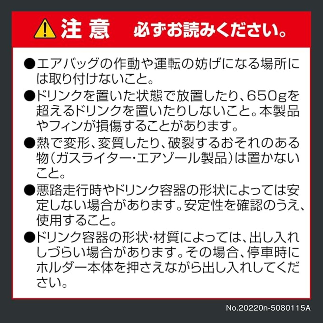 ●本製品の幅・奥行き・高さが確保でき、本製品の上方にドリンク容器を出し入れできるスペースが確保できることを確認してください。●製品取付部の上方に、40mmを超える内装の出っ張りがないこと。●取付面の傾きが、垂直から15~30度傾斜していること。●レバー・ドアノブ・スイッチの操作に支障がある場合は取付けないこと。●本製品を取り付けると、車両のエアコンフィンの操作はできなくなります。