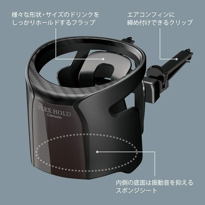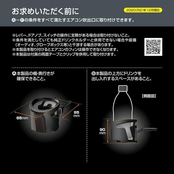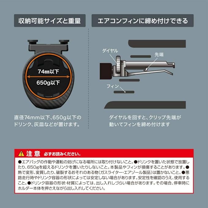 ・ドリンクを置いた状態で長期間放置したり、650gを超えるドリンクは置かないこと。本製品や車両エアコンフィンが損傷する恐れがあります。