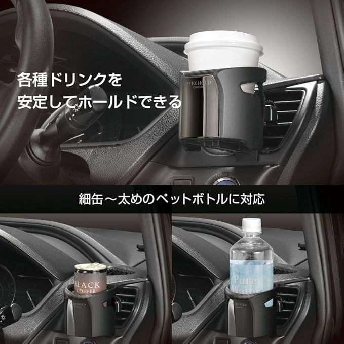 ホールド部の前後2か所にスプリング式のフラップを搭載。十分な可動範囲で、細缶から74mm径のペットボトルまでを幅広く対応。
