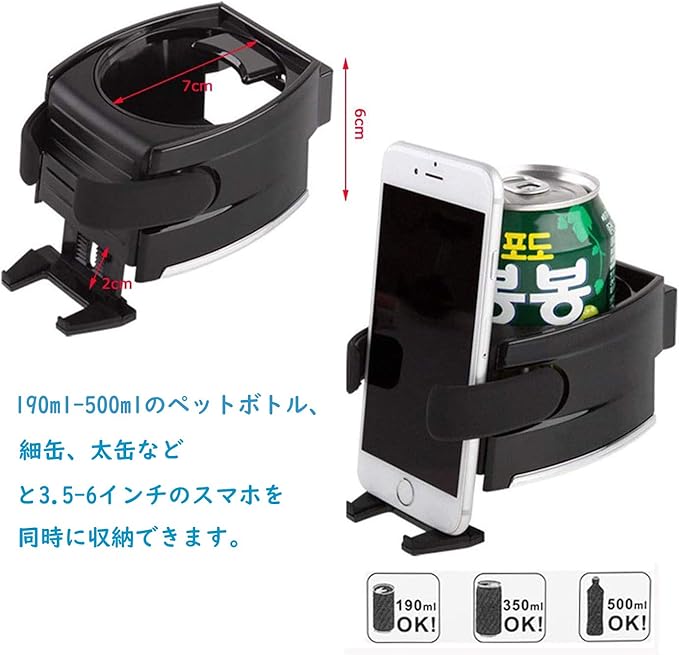 【ドリンクホルダー & スマホホルダー 2in1 コンパクトデザイン】 この車用ドリンクホルダーは、190ml~500ml のペットボトル、細缶、太缶に対応し、3.5~6 インチのスマホ(手帳型ケース装着時も OK)を同時に収納できます。運転中もスマホ操作やドリンクの取り出しがスムーズに行え、利便性が大幅アップ!