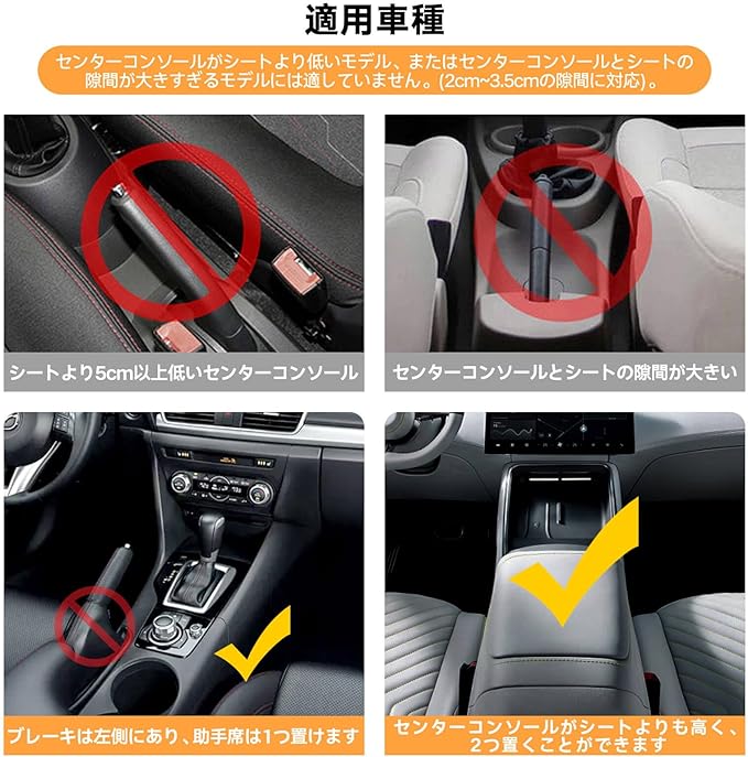 【適用車種⚠️】シートより5cm以上低いセンターコンソール、またはセンターコンソールとシートの隙間が大きすぎるモデルには適していません (1.8cm~3.5cmの隙間に対応 )。ご注文前はご愛車は取り付け出来るかどうかをご確認ください 。
