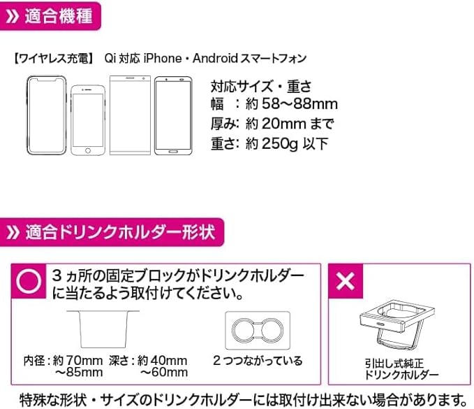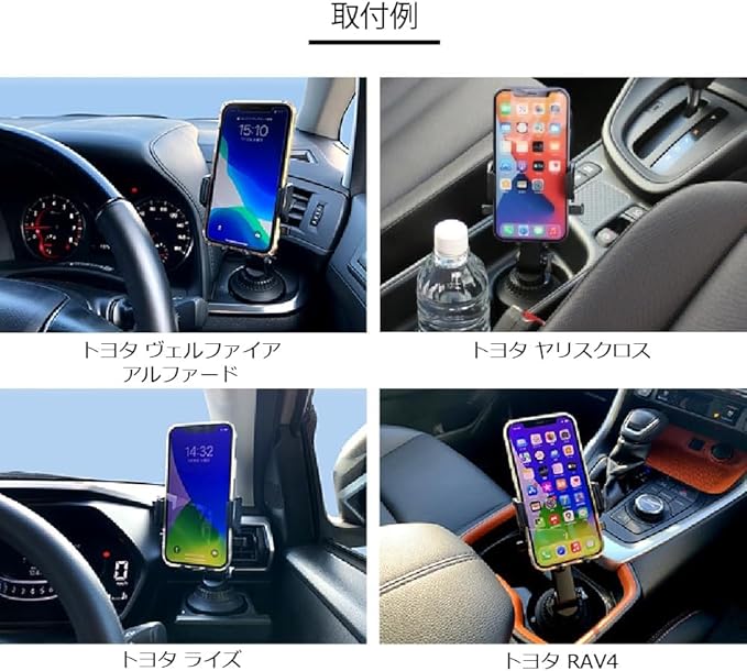 スマホの縦&横置き対応。お好みの位置に合わせて上下伸縮も可能。ドリンクホルダー取付スタンドは設置後も360 回転。人気車種 アルファード/ノア/ヴォクシー/n-box などにおすすめ 手帳型ケース レザーケース シリコーンケースをご使用の場合でもワイヤレス充電は可能ですがケースの厚みや形状により充電ができない場合がございます